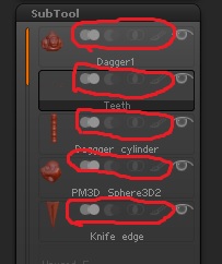 Hi guys I want to know what are these options for that I highlighted in red in the Subtools pallete and does zbrush Have a see through mode so I can see through from one subtool to another?