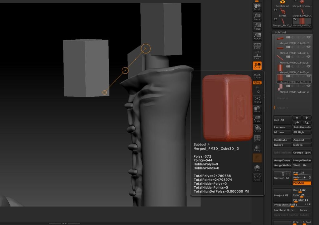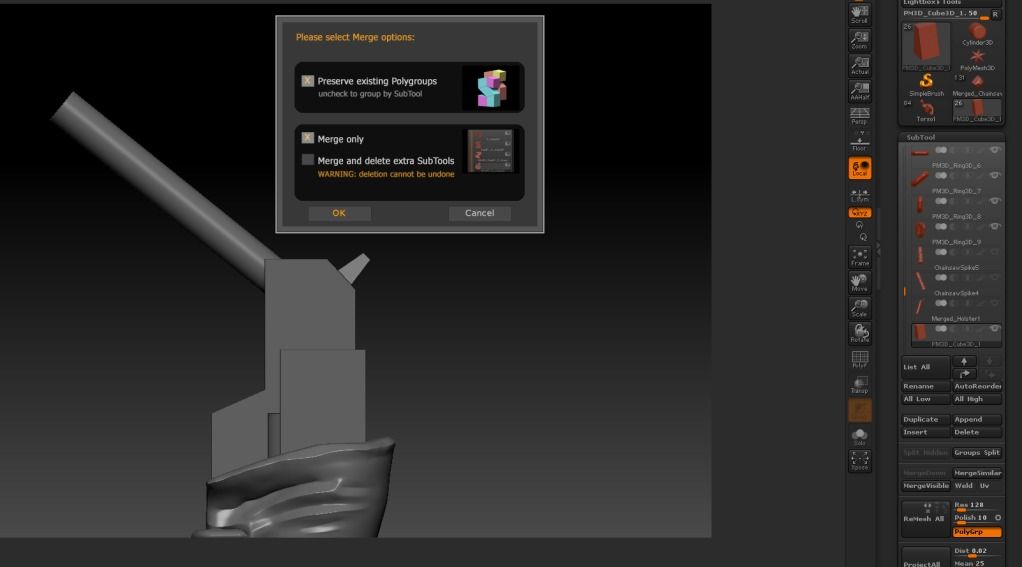 I’ve just merged all the pieces of a weapon (using the SubTool Master) and then appended that merged weapon tool into my character project to position it in the correct place. Once the weapon is in place I split the merged weapon tool by using the Groups Split button in the Subtool menu to fine tune a few things.