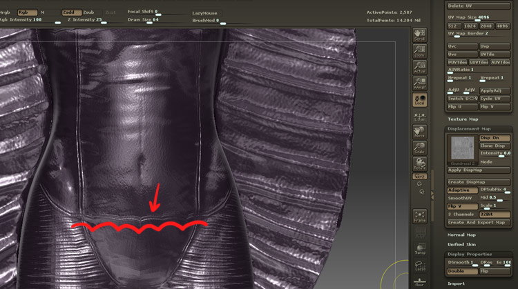 when it applies to my model (which happens immediately after creation) my straightly sculpted stitching lines become wavy and distorted.