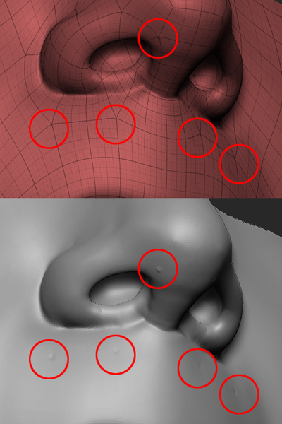 Also notice that those spots are exactly where poles are, which are vertices where more than four edges meet. If you’re making base meshes in another 3d program to ZBrush, try to keep these poles to a minimum, and try to use all quads, with as few triangles as possible, but no ngons.