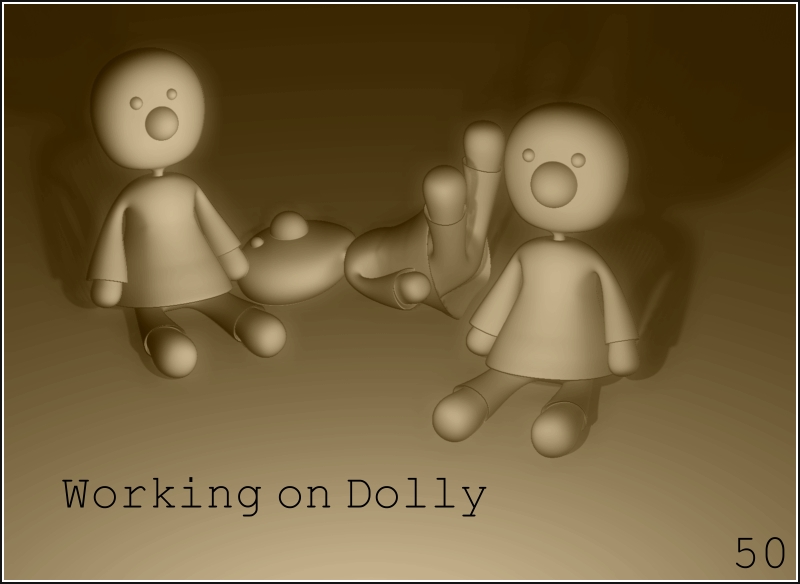 Well, hello everyone, it’s been toooo long without Zbrush. After another crash on my old pc, I bought a dual core amd and with the help of the people at element 5, I have a new Z workstation. (It multithreads at 6.185 down from 10,034 single for 38% increase.) With the new power I’ve started redoing some old projects. This is a prop for my old ‘Dream Window’ picture which I can now make big enough for large prints. Dolly is to add some girly toys in the window. Anyway here’s dolly. 50.