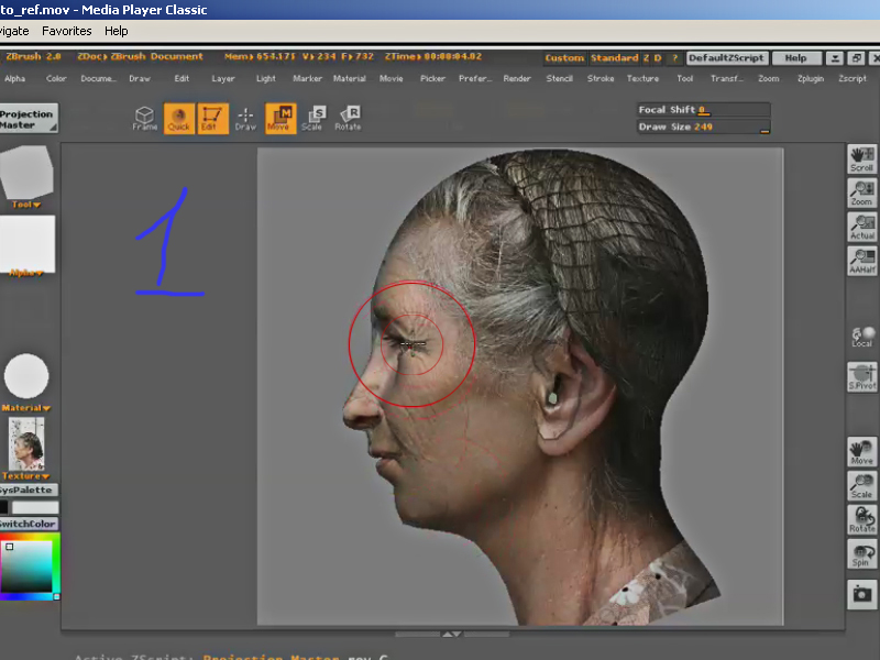 Hi everyone)I have problem with which im agonizing for a long time)This is because when I try to texture my character in z-brush using 3dplane with Zadd set to 0 in Project Master mode.I cant see my mouse cursor when im editing texture.So its difficult for me to explain you exactly,because english is not my native language.and im posting you screenshots.Picture 1 is a screenshot from video tutorial.And picture 2 is a screenshot from my own working process))As u see i have some red point instead of round mouse cursores.And its very difficult to me to wrap the texture.Plese help me,tell me what im doing wrong.Thanks you beforehand !!