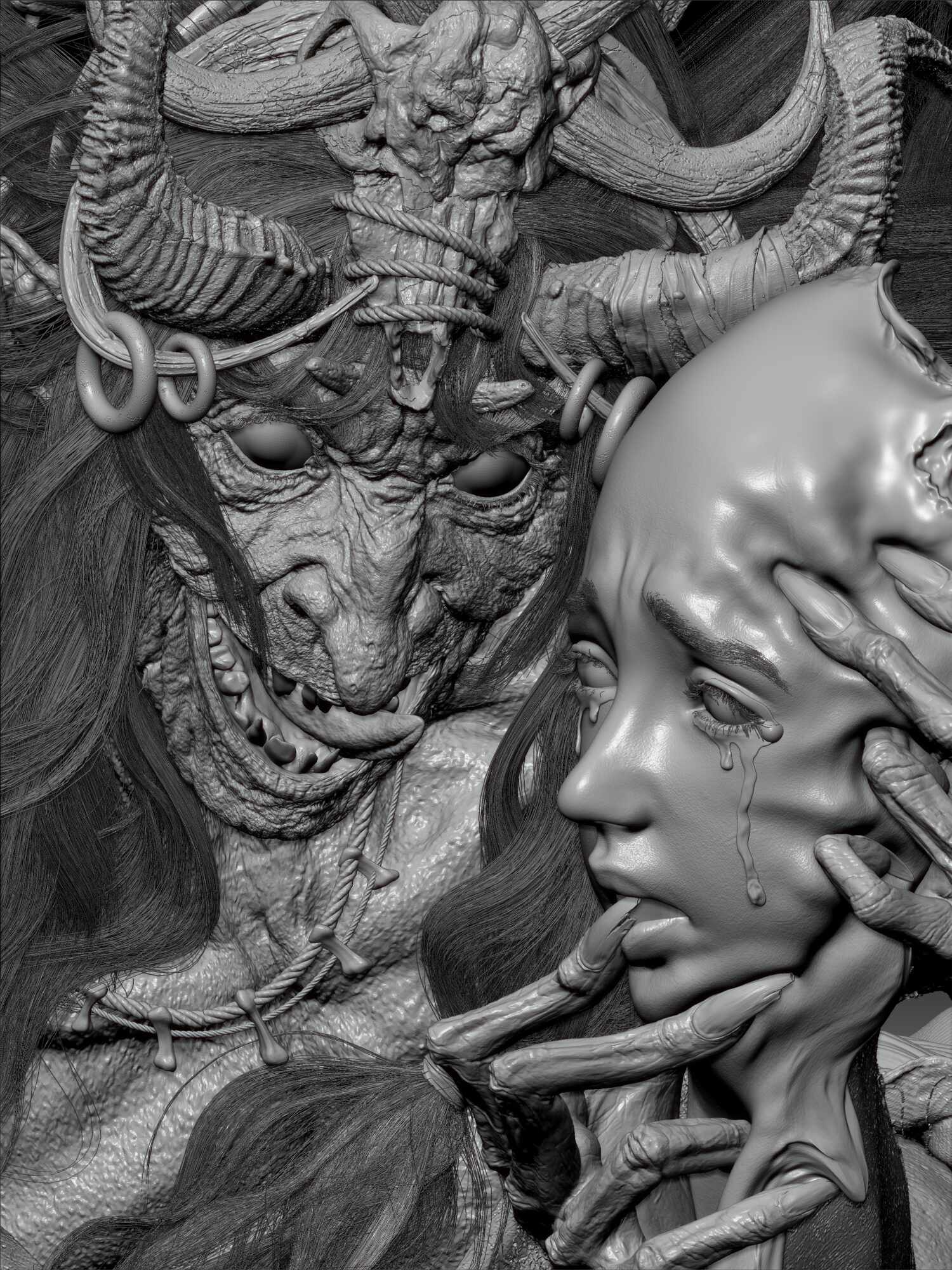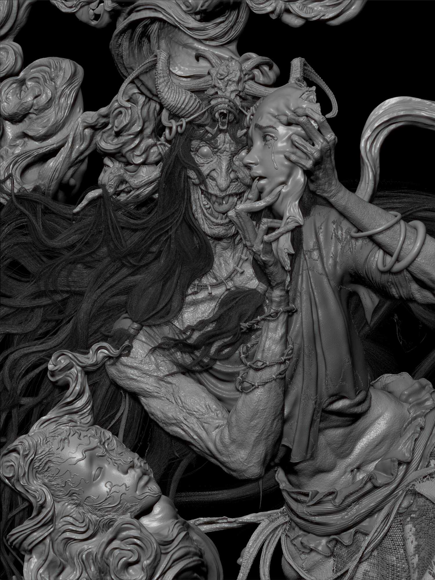The girl in her hands is the latest offering — perhaps a sacrifice, perhaps a lost soul.