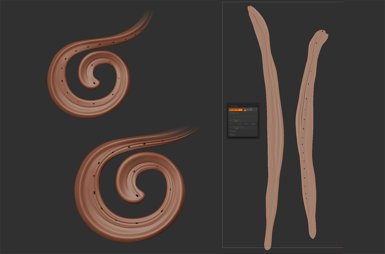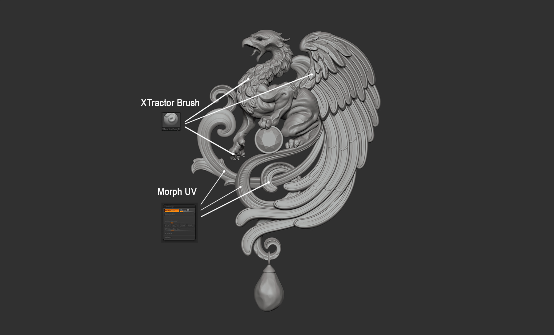 Attached you can see some WIP images as the usage of the XTractor Drag Rectangle for the claws and the Morph UV feature to sculpt the curved lines on te scrolls