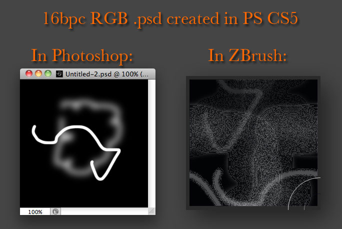 In ZBrush 4r2, as soon as I try to import a 16bit alpha it firstly, takes a long time for the software to regain interactivity (i.e. takes like 30sec or so for import to complete) and when it does come back, the 16bit alpha is not showing properly. Usually its just blank. (The alpha in question is from photoshop, psd format. grey mode, no alpha channel)