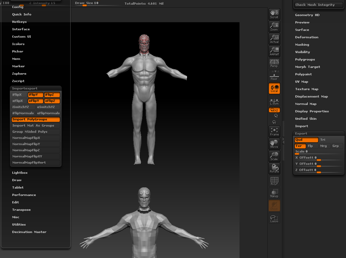 Here I tried to export from Zbrush to Maya and back again. And the model appeared lower. And seems bigger.