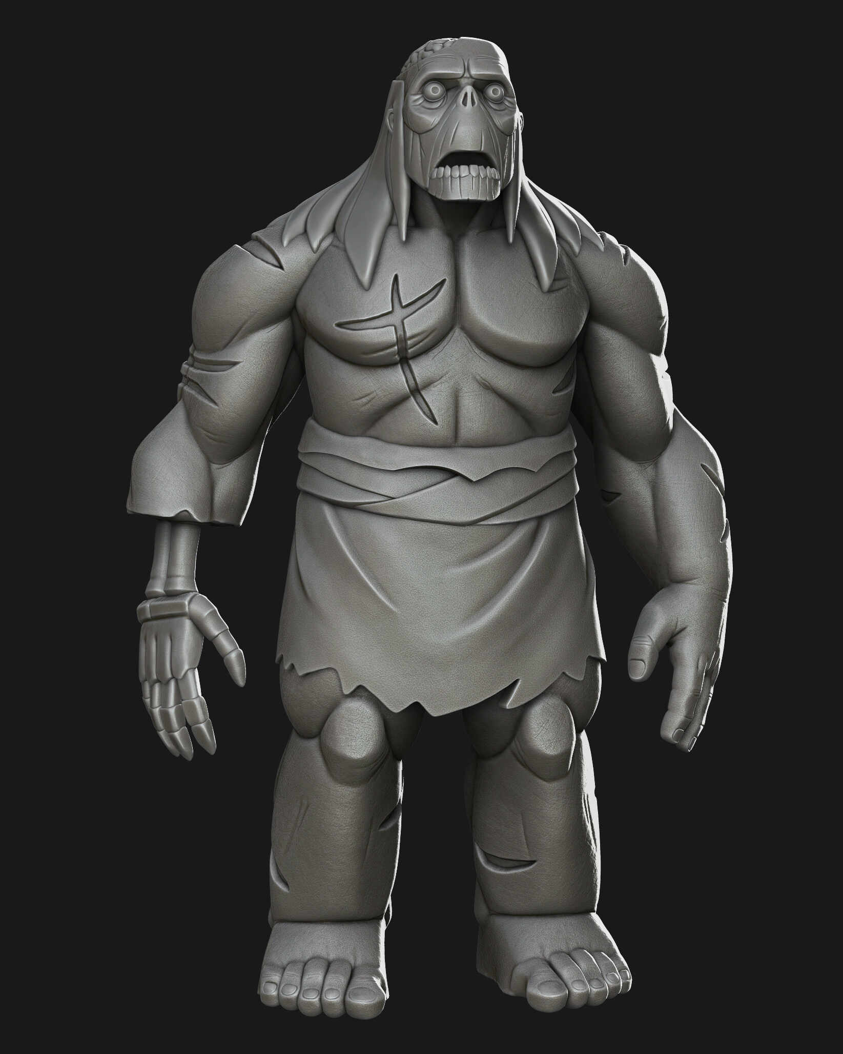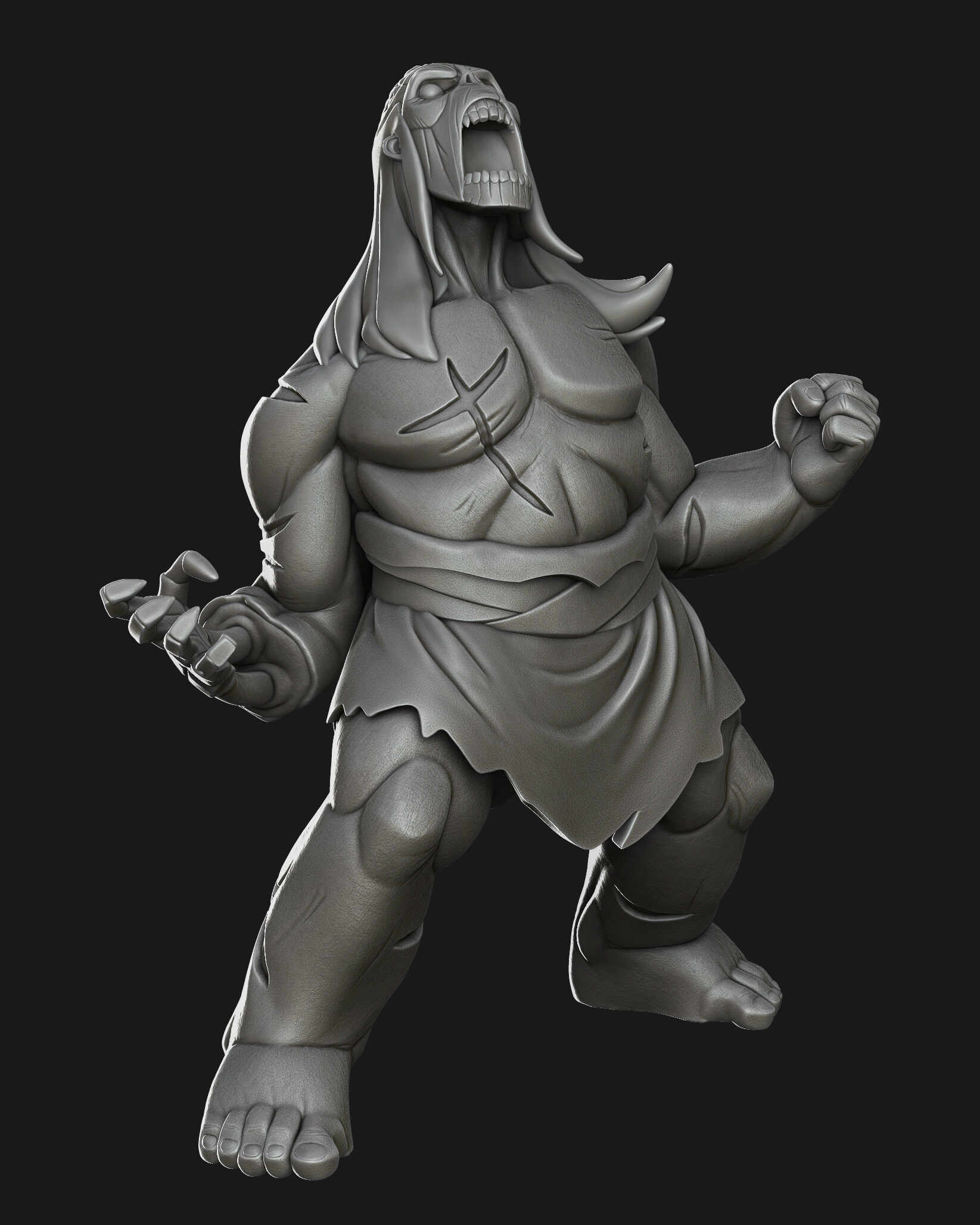 Stylized character study inspired by the visual language of Primal. The goal was to translate the show’s bold 2D graphic style into a volumetric 3D sculpt while preserving strong silhouette design and exaggerated anatomy.