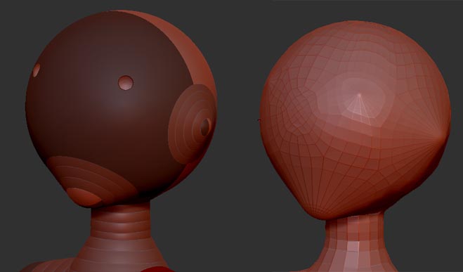having the zsphere mesh actually push in and make an indentation isn’t really that important. Getting the topo that you want to be able to have loops in the eyes and such is much more important. you can always just push the mesh back into the head. Remember that zspheres are an ends to a means, not the end all be all.