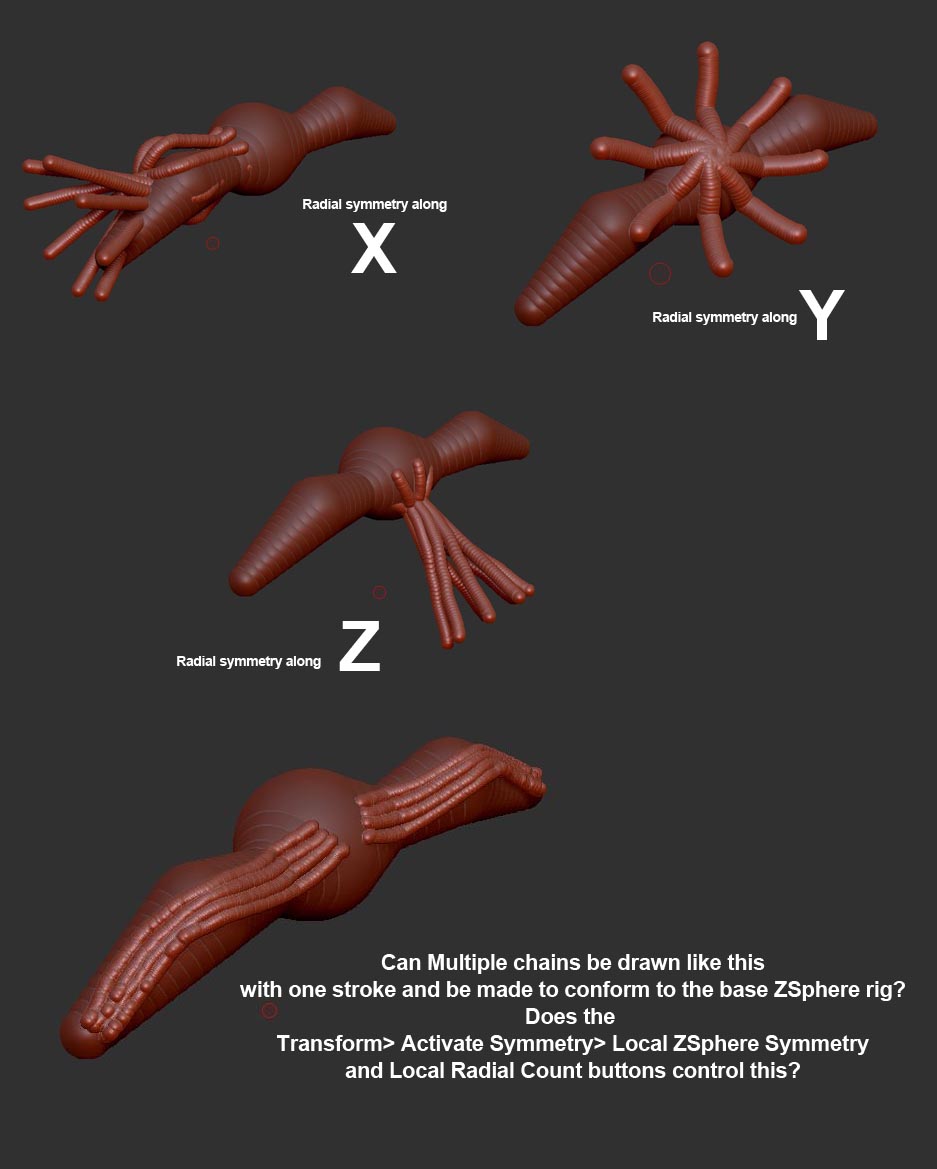 Also, is there any way I can draw multiple rows of Zketch lines on my base ZSphere rig instead of single chains. Radial symmetry is restricted to the x, y z perpendicular directions. I want the rows to conform to the base ZSpheres. Something like the clumsy example at the bottom of the attached image.