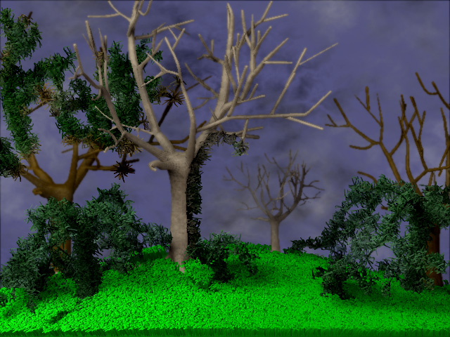 four layers and the fiber materials…blue background, fog and fog textures from the default textures… one the little bushes I used the fiber mats totally… and on the stuff growing up the tree…I first did the tree using Mtb’s mat setup…then went back with the simple brush and with no sub or no add and used a shade of green with the Mrgb only and brushed a shadow stroke up the side of the tree…the materials between the tree and the fiber handled well with each other without baking one first…remember when doign your best render and using the Fiber material …the Fiber button must be pressed in the Render pallette. It should do 2 passes…first one rendering the shadows etc, and the second one moves quicker rendering the fiber material…might be lame but I found it to be pretty fun and kewl…(42 year old children are so easily amused…lol)